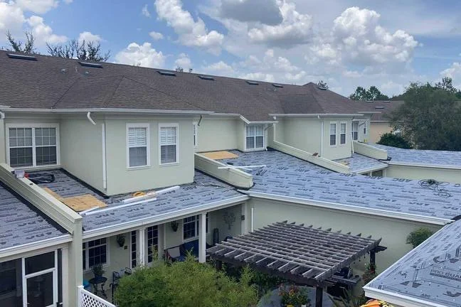 Project Summary: Composite tile to shingle roof replacement (84,279 sqft.). Extensive custom carpentry for fascia, soffit, gable ends, and screen enclosure repairs. Whole community gutter replacement, painting of all trim and stuccoed surfaces.